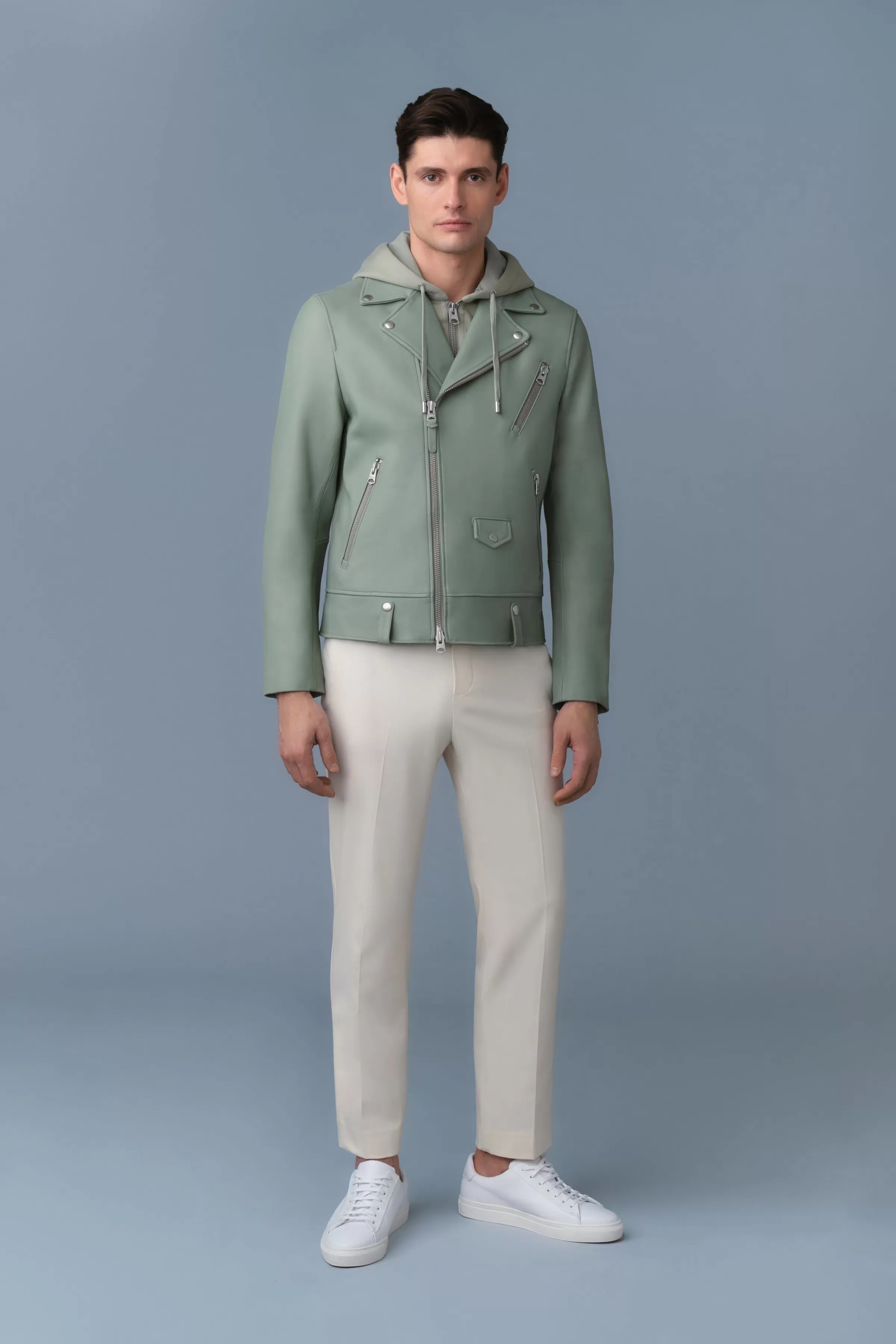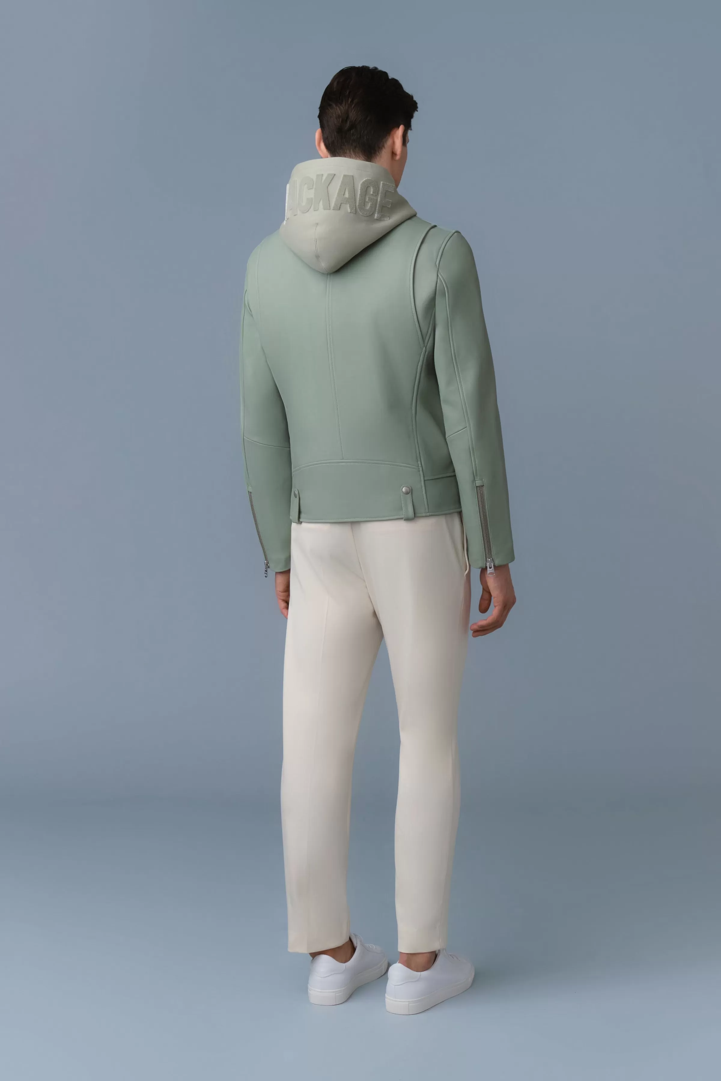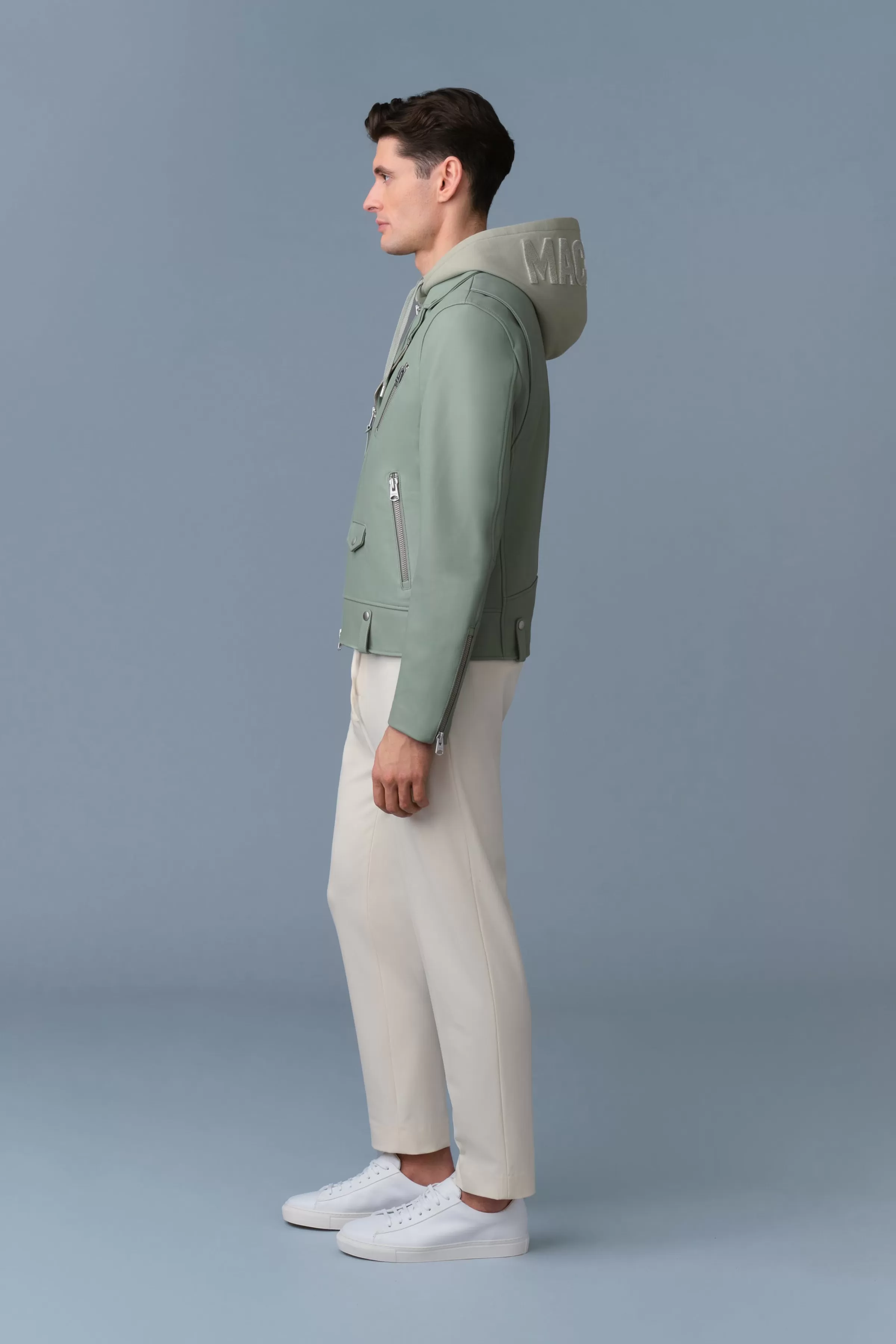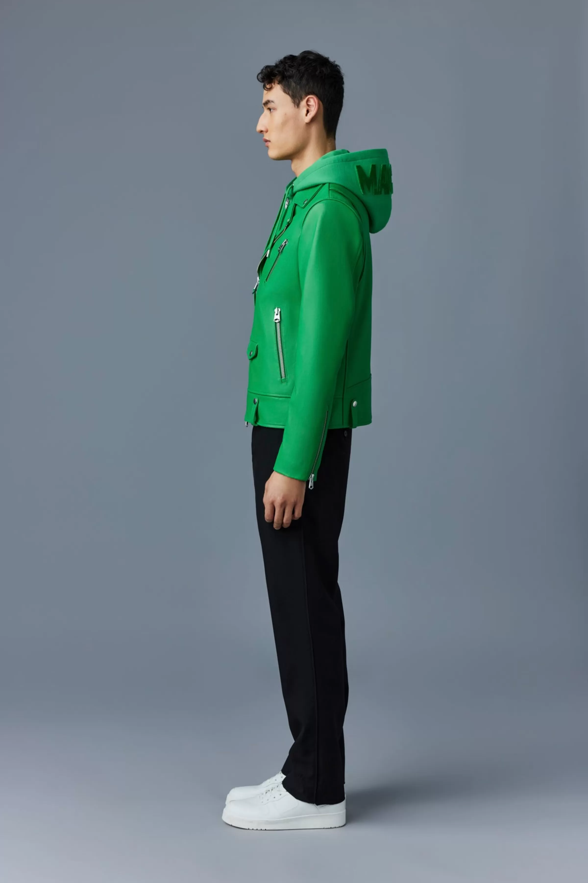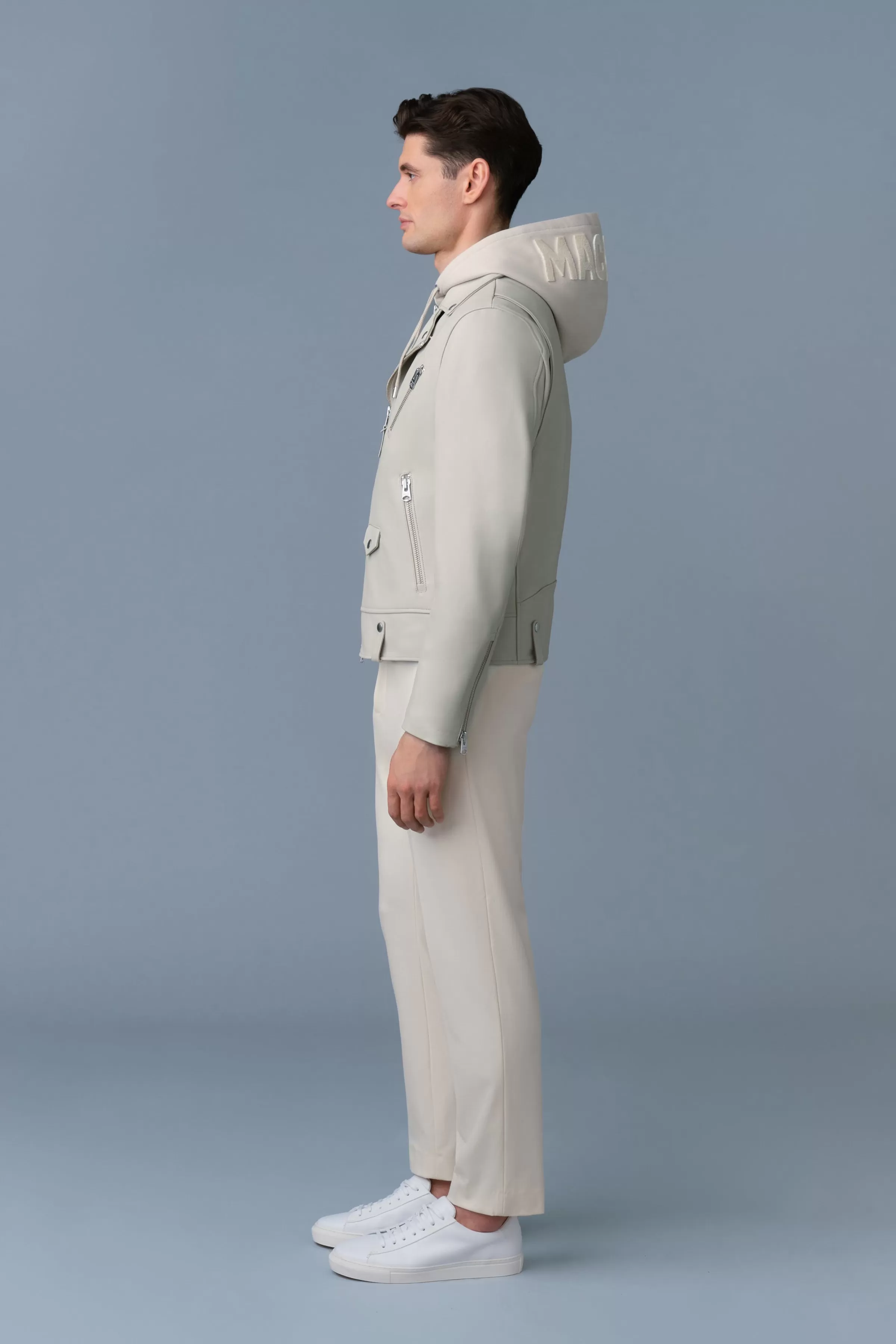 MAGNUS-CN is a classic biker for men crafted from supple lamb leather. Expertly tailored for a slim fit, it features a removable tonal hooded bib made from plush double face jersey. The asymmetrical closure, notch collar, and studded tabs bring signature detailing. Action back paneling adds to the comfortable feel. A modern and modular statement layer.