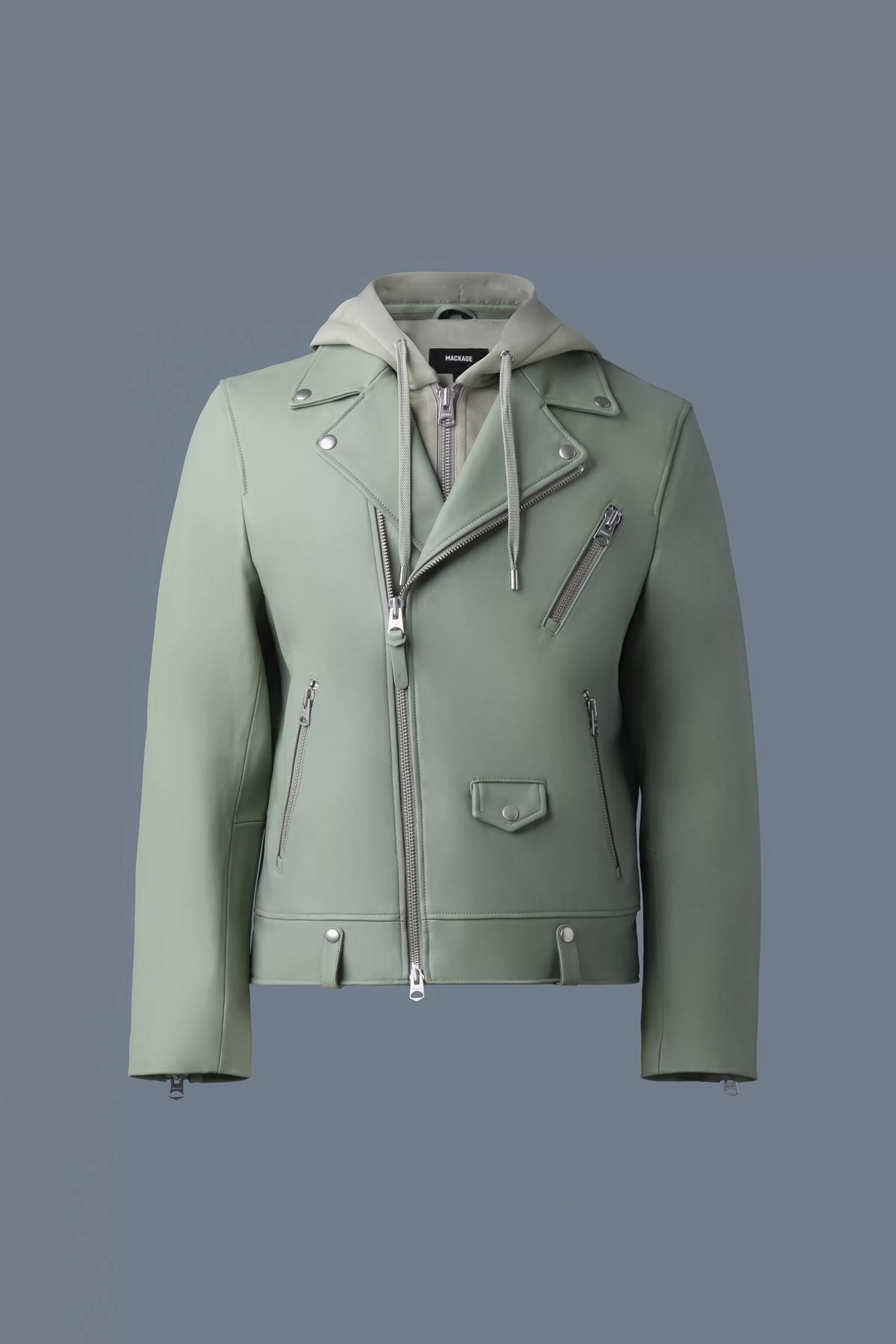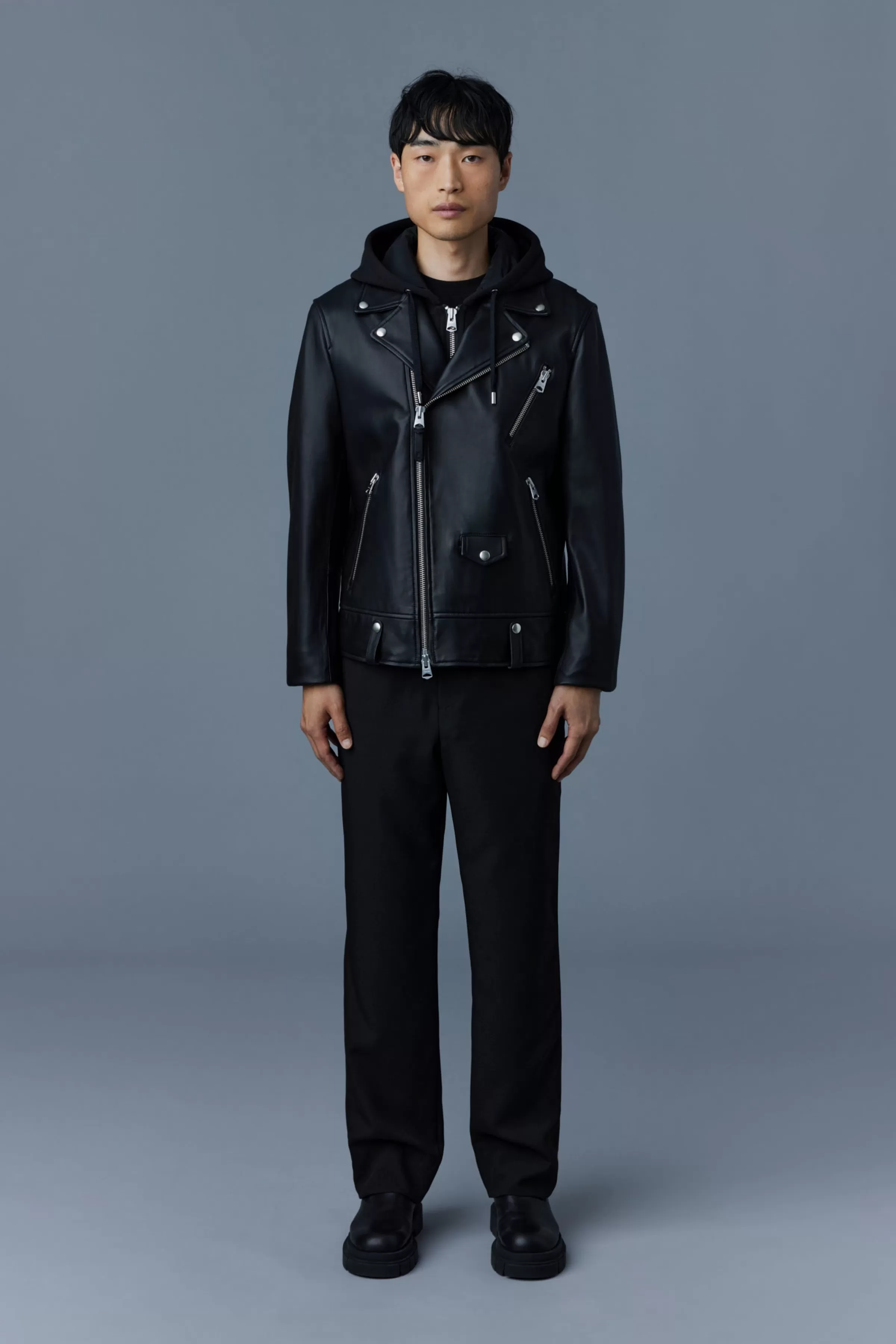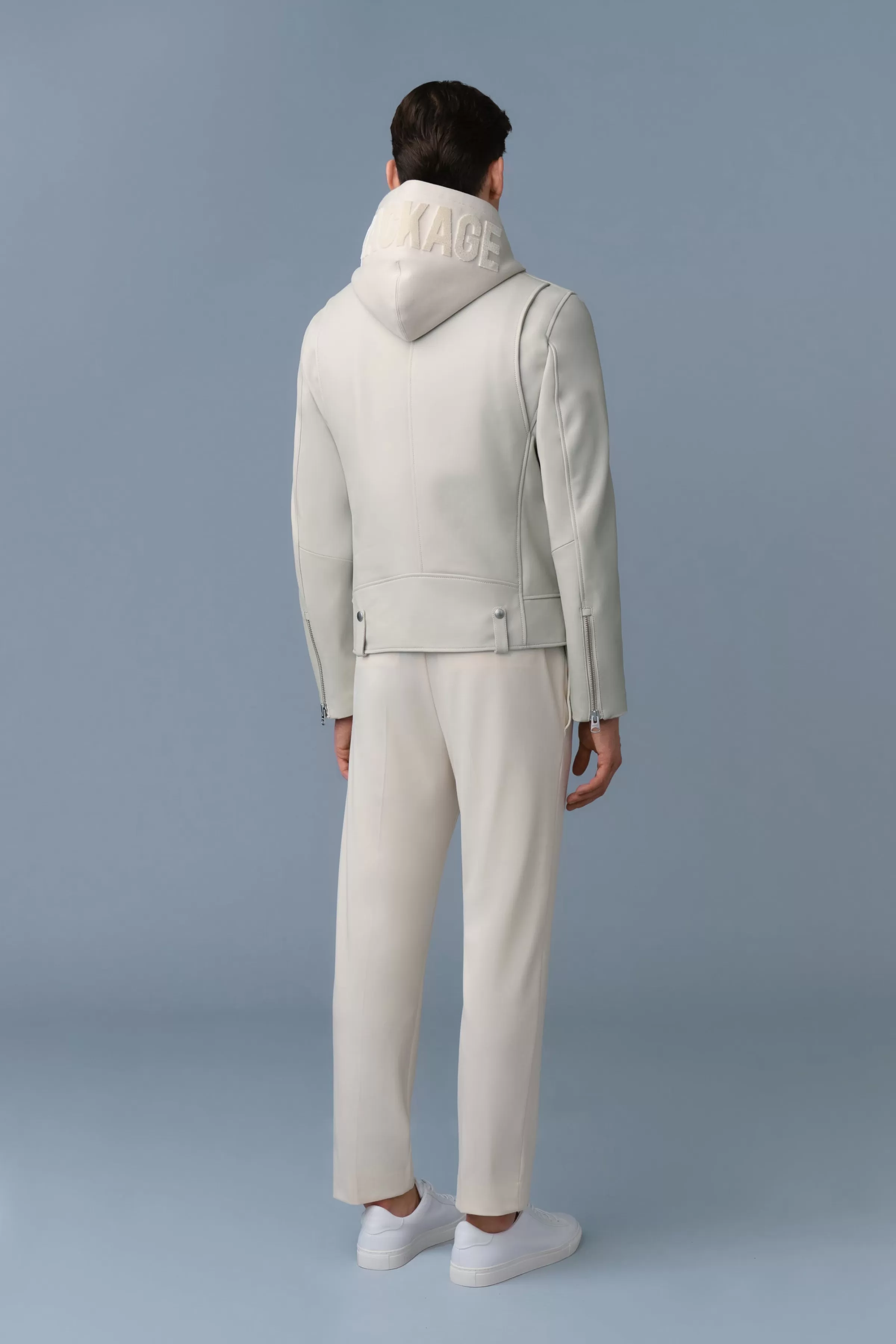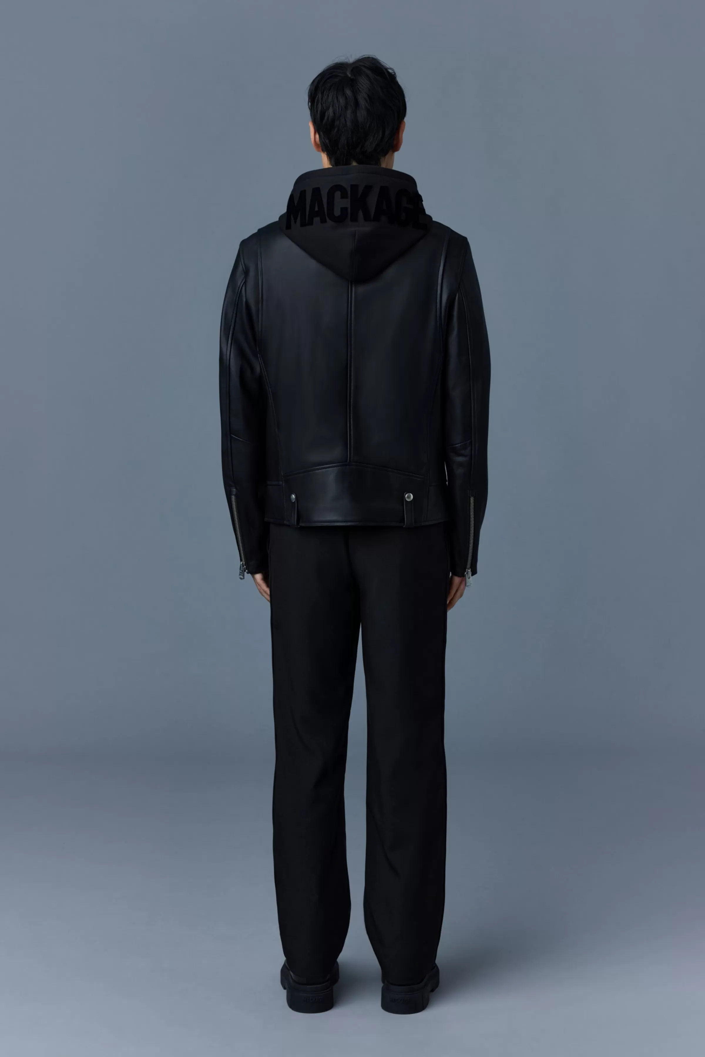 MAGNUS-CN is a classic biker for men crafted from supple lamb leather. Expertly tailored for a slim fit, it features a removable tonal hooded bib made from plush double face jersey. The asymmetrical closure, notch collar, and studded tabs bring signature detailing. Action back paneling adds to the comfortable feel. A modern and modular statement layer.