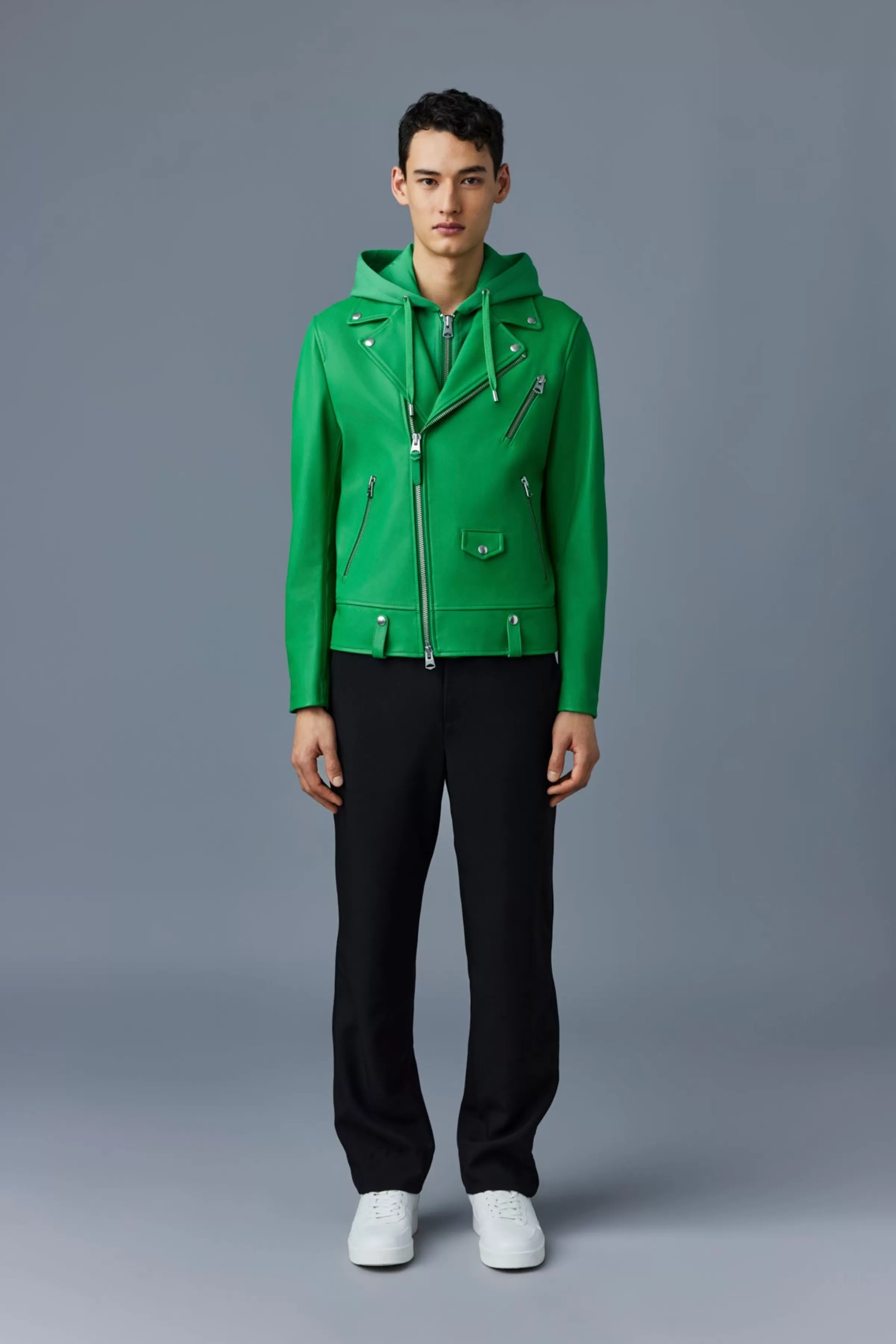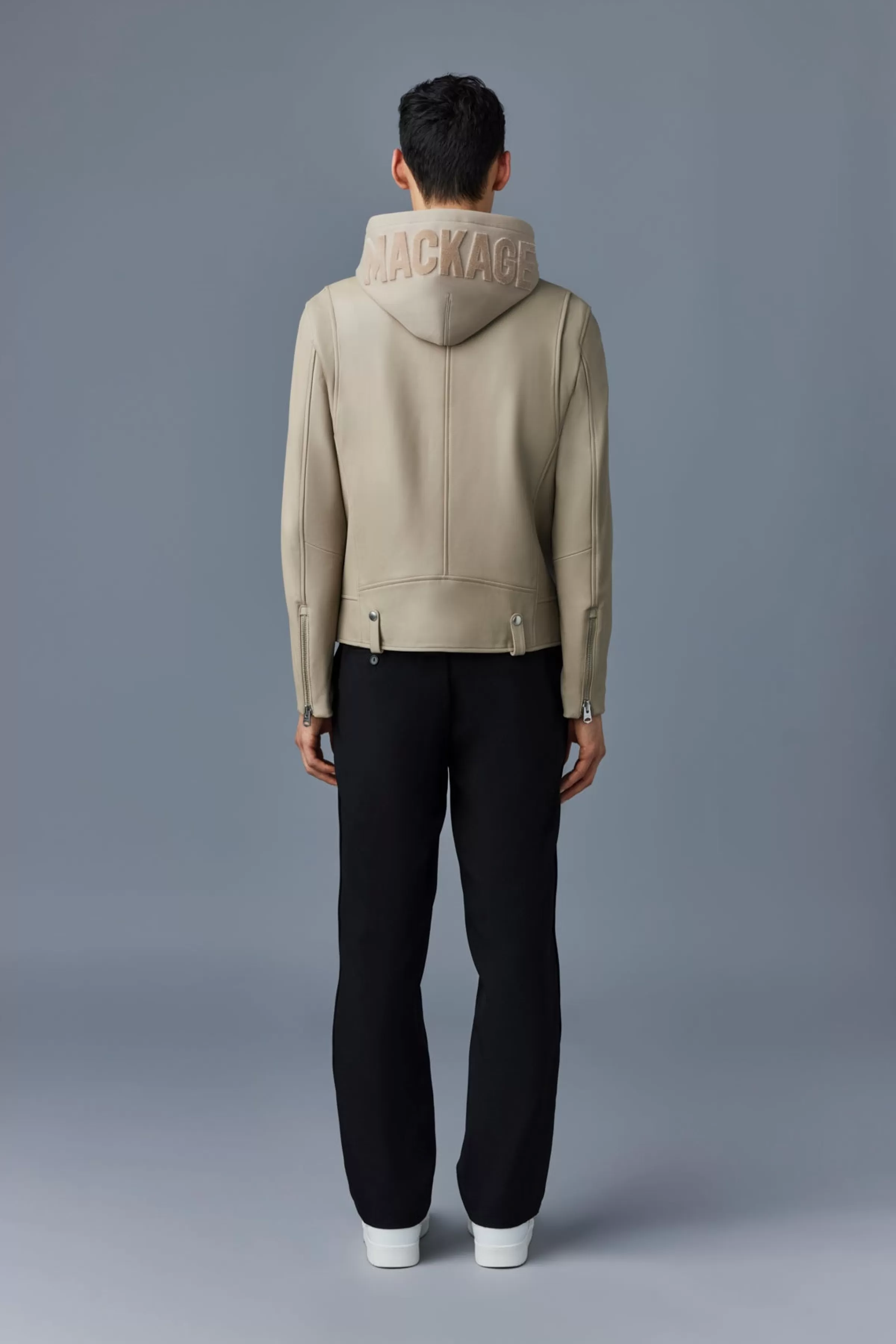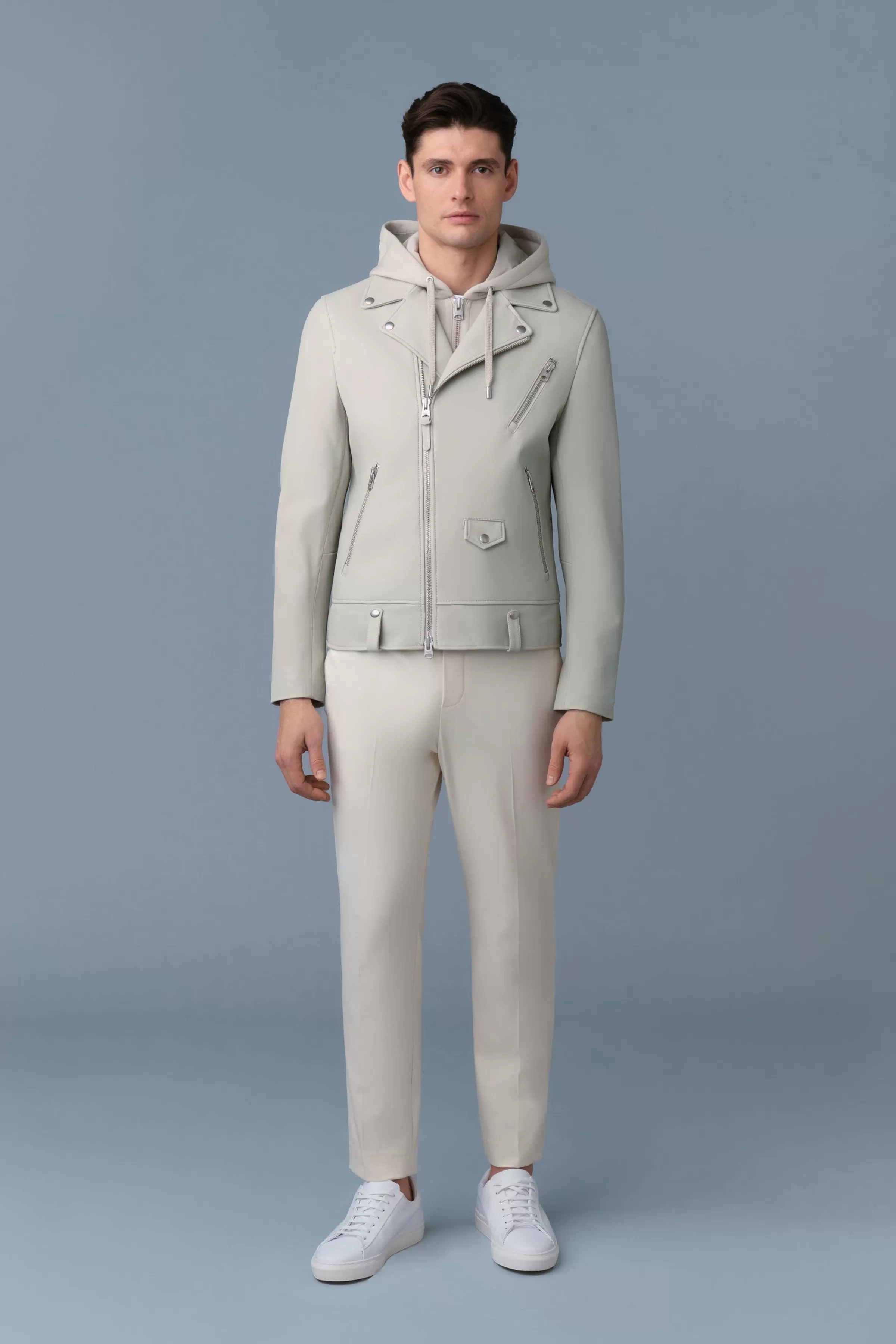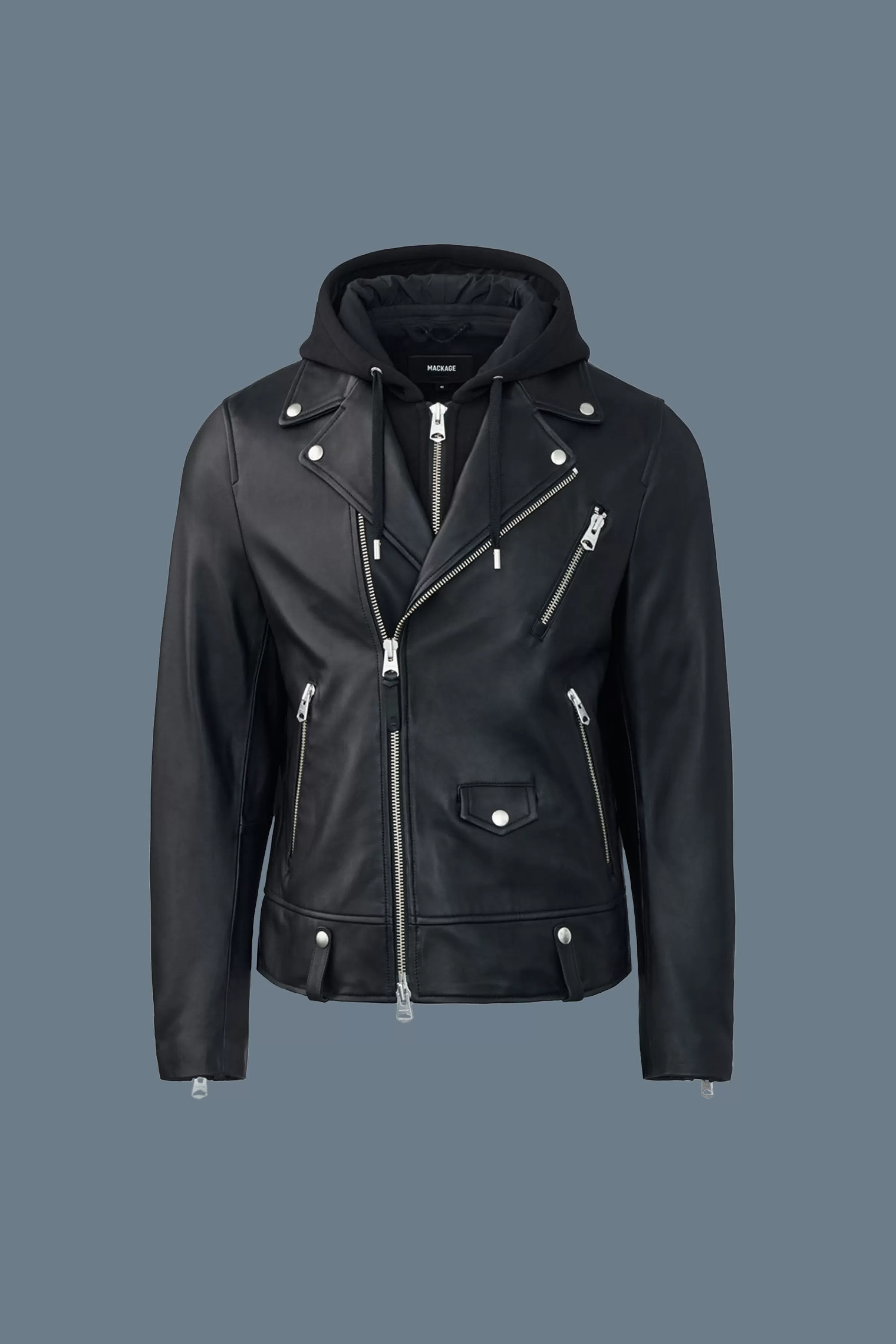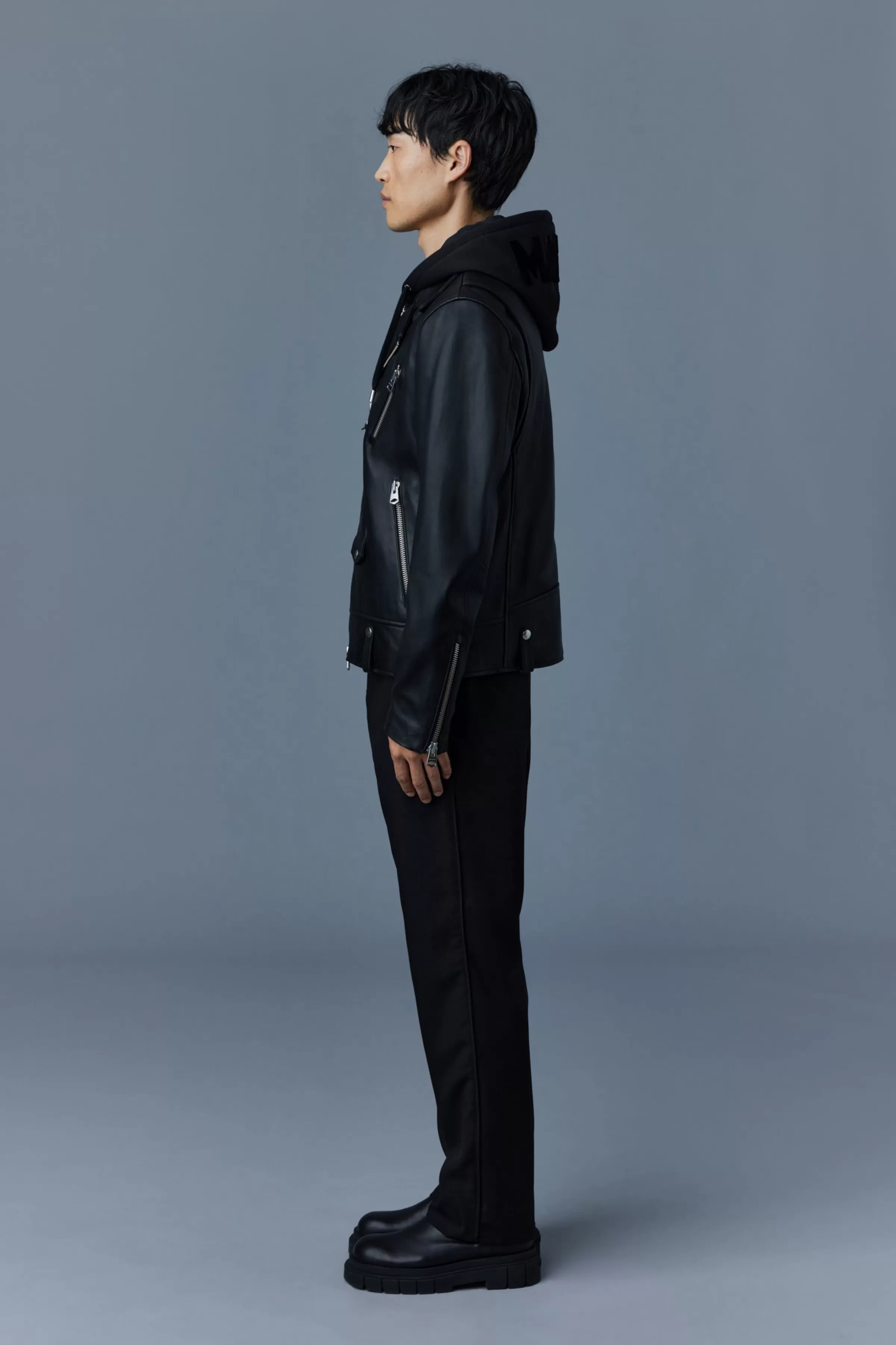 MAGNUS-CN is a classic biker for men crafted from supple lamb leather. Expertly tailored for a slim fit, it features a removable tonal hooded bib made from plush double face jersey. The asymmetrical closure, notch collar, and studded tabs bring signature detailing. Action back paneling adds to the comfortable feel. A modern and modular statement layer.