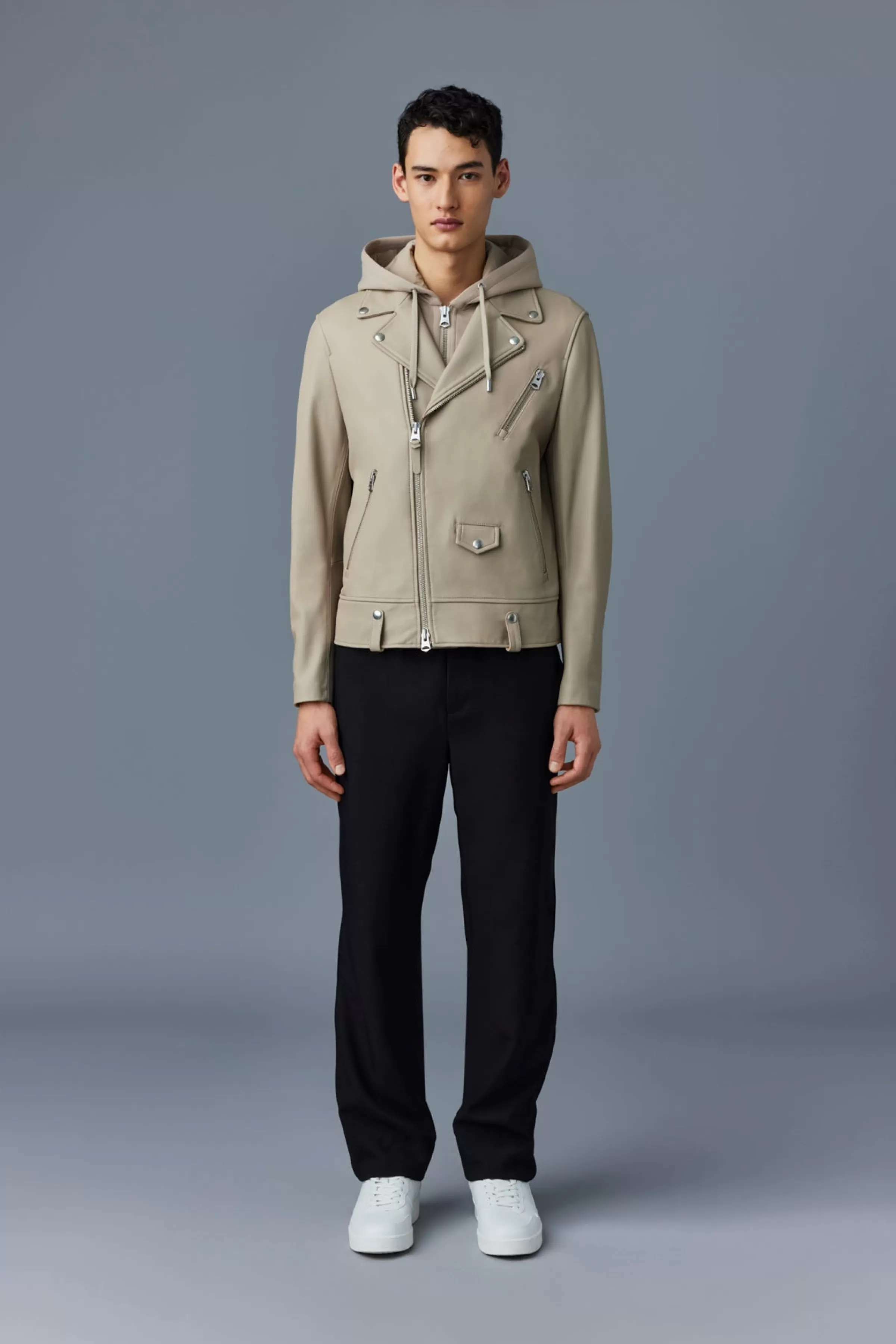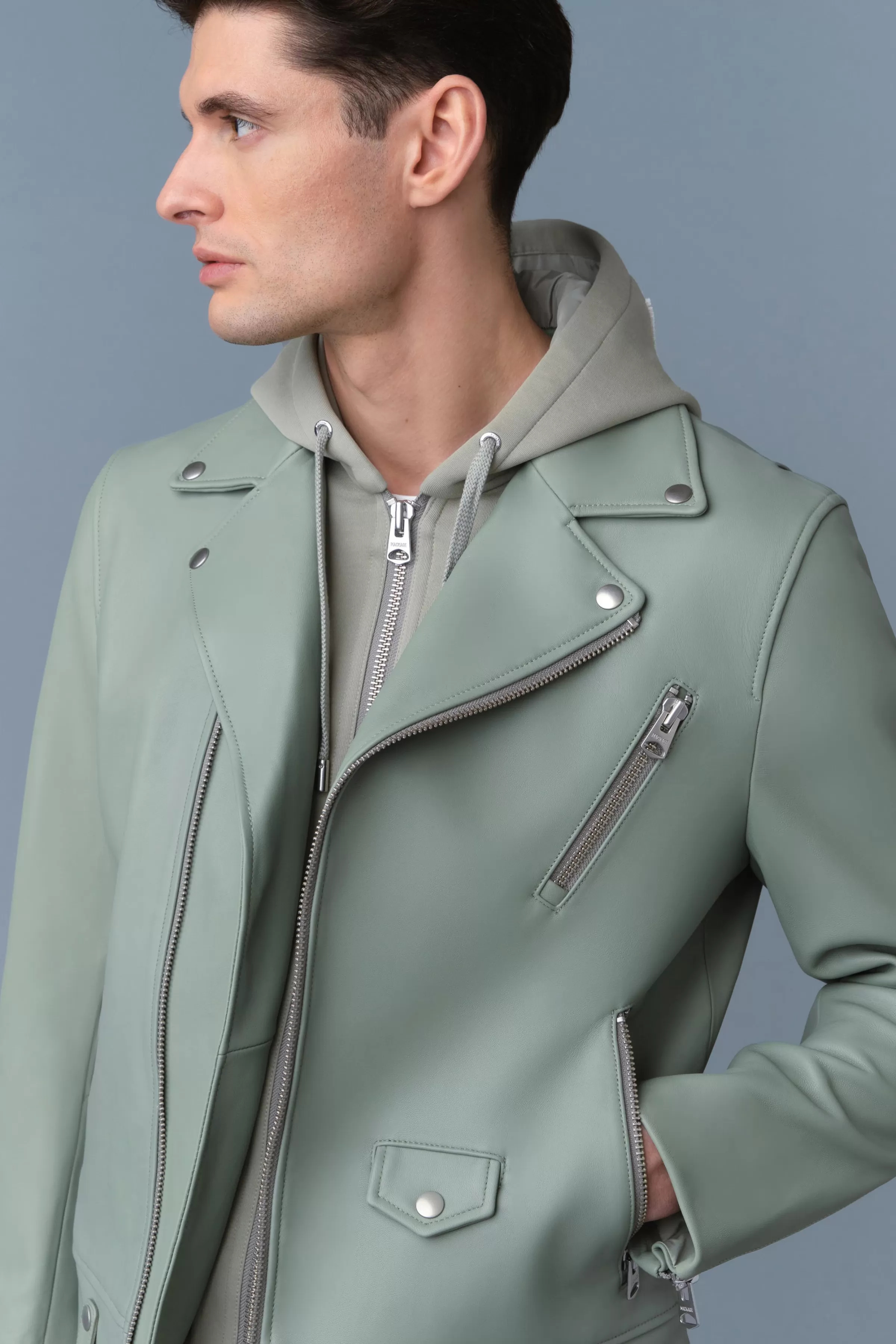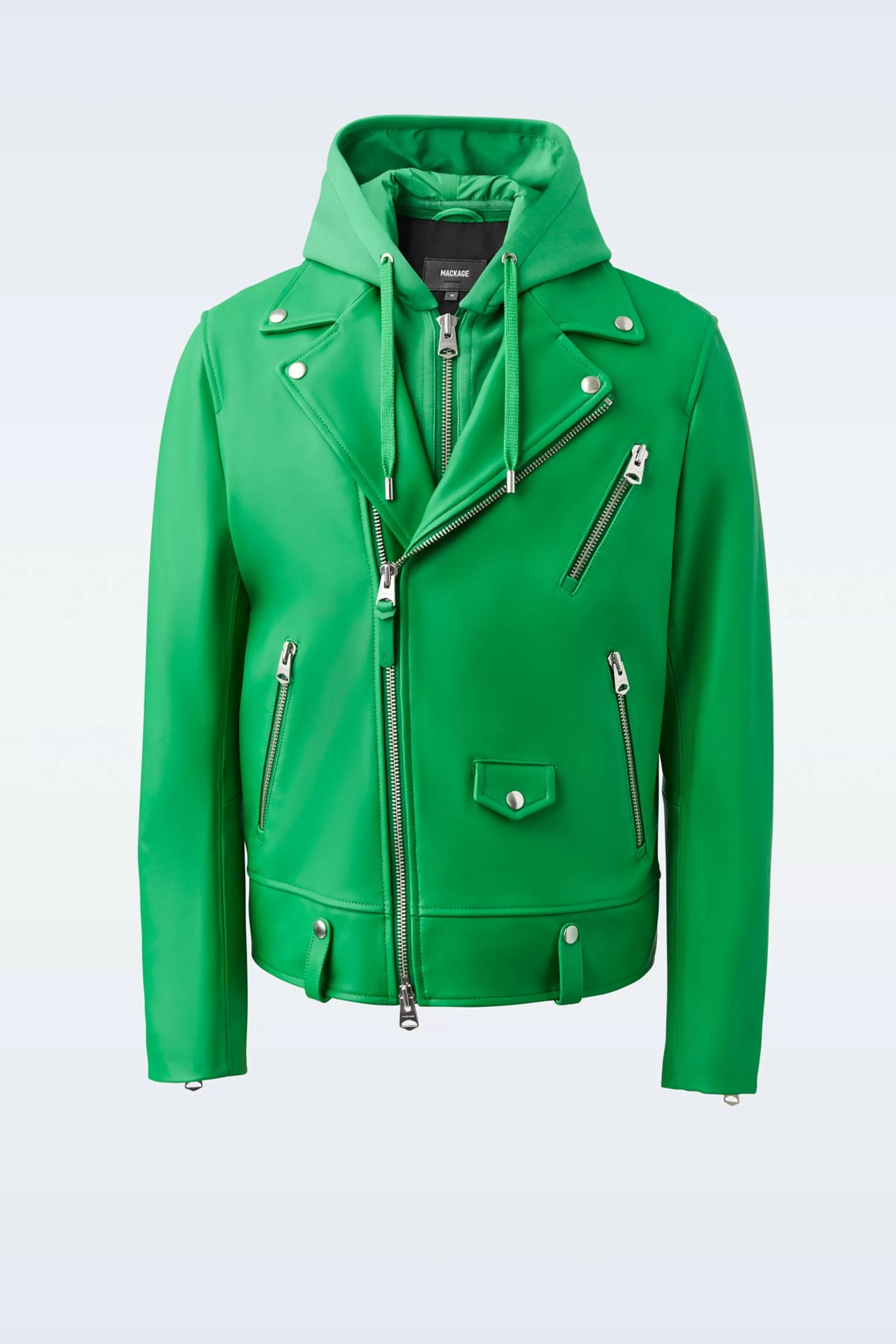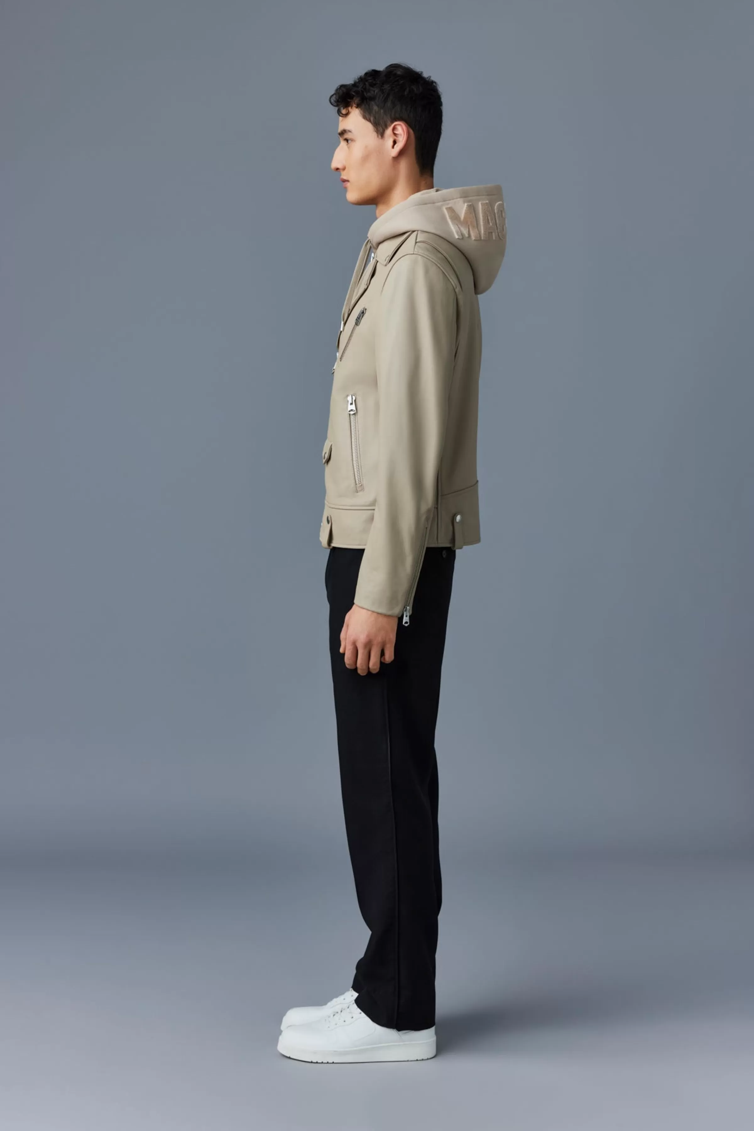 MAGNUS-CN is a classic biker for men crafted from supple lamb leather. Expertly tailored for a slim fit, it features a removable tonal hooded bib made from plush double face jersey. The asymmetrical closure, notch collar, and studded tabs bring signature detailing. Action back paneling adds to the comfortable feel. A modern and modular statement layer.