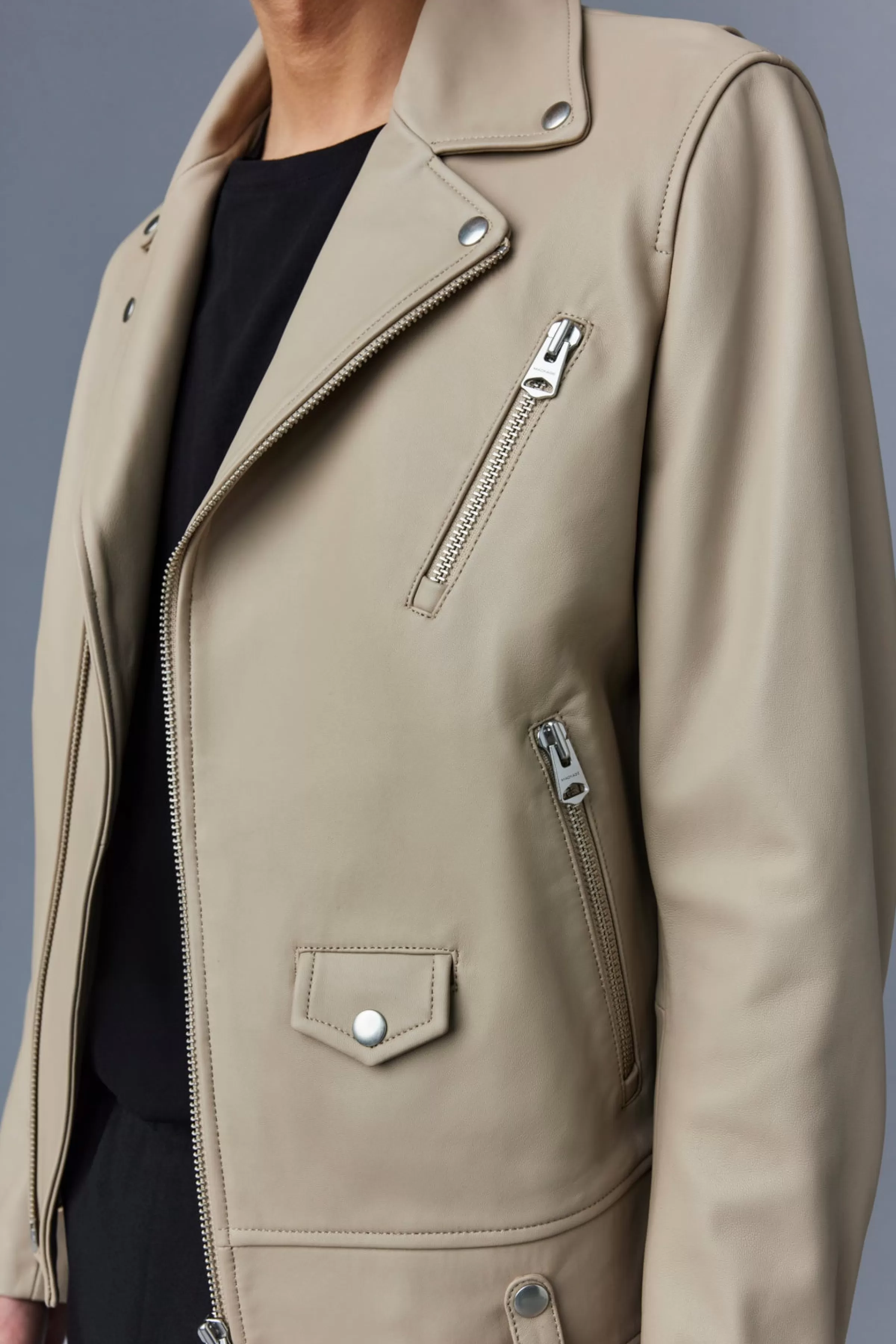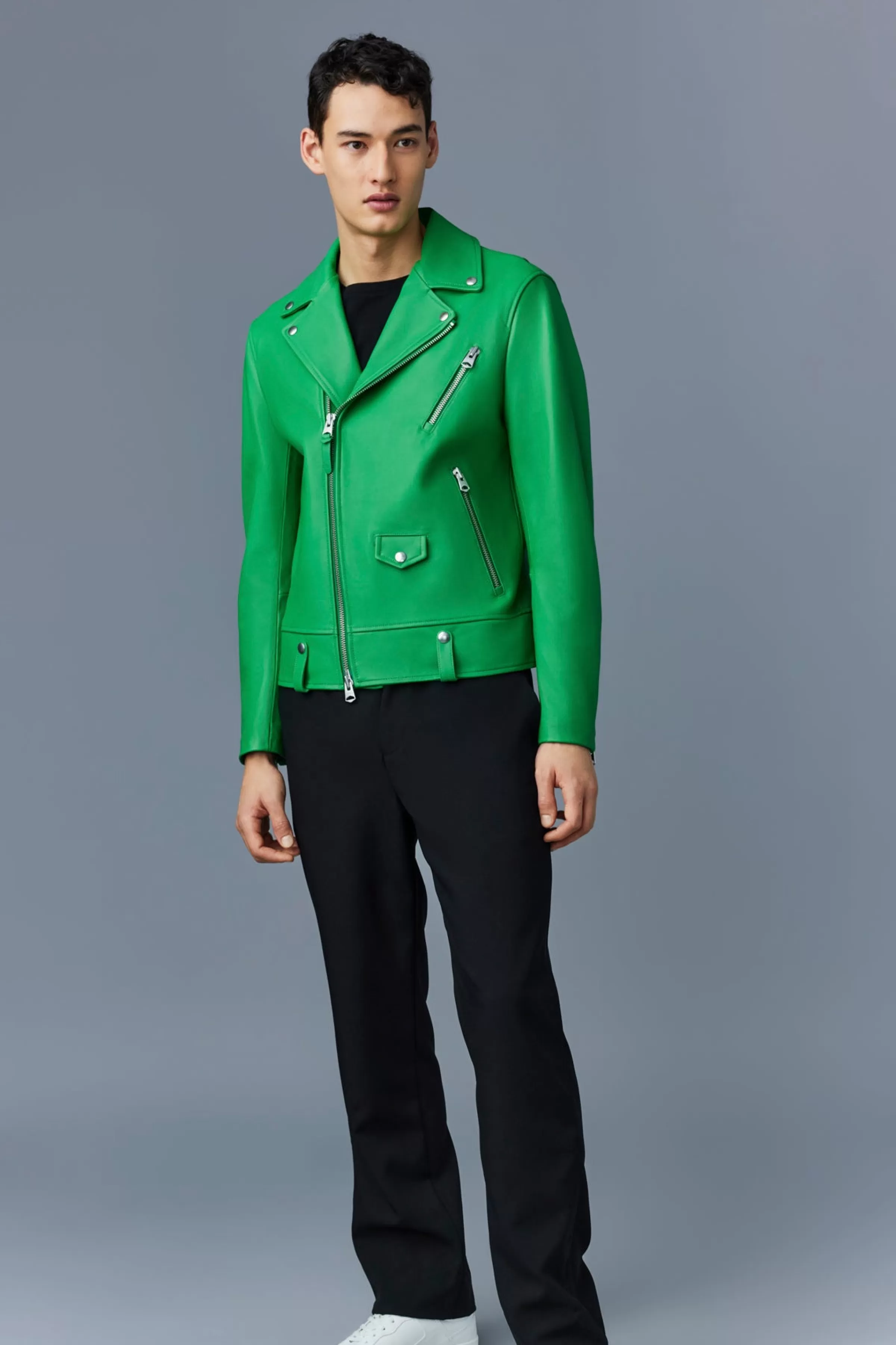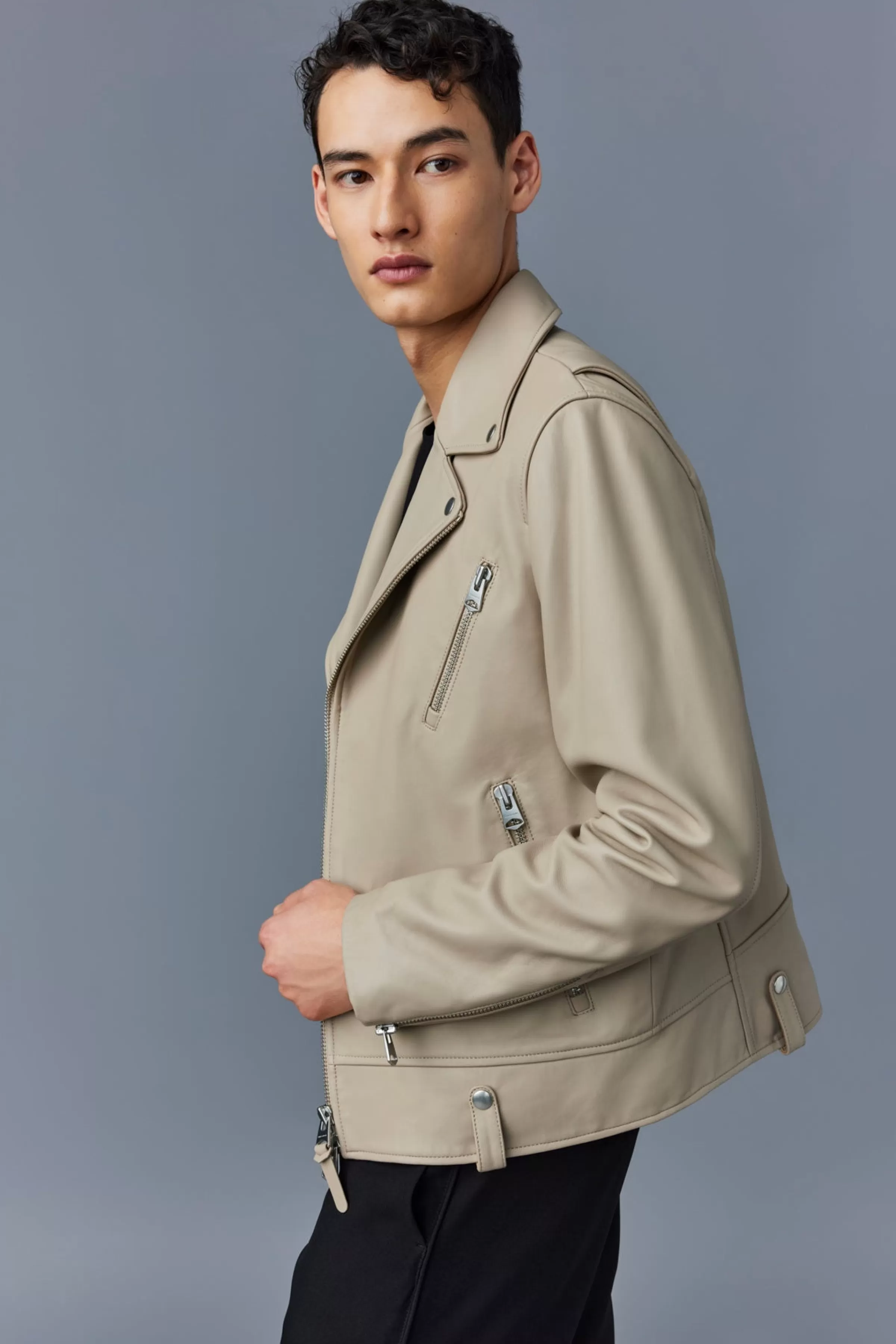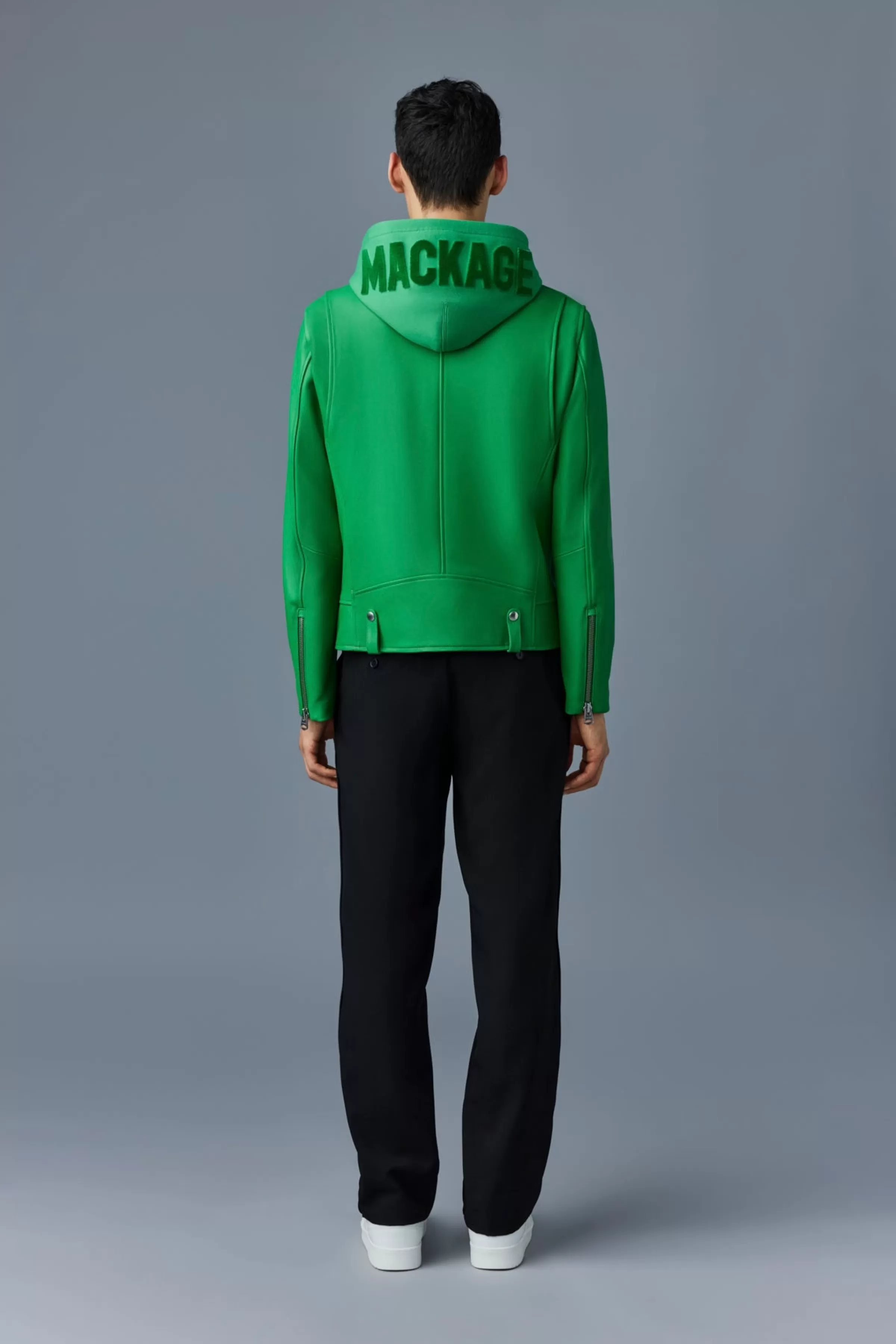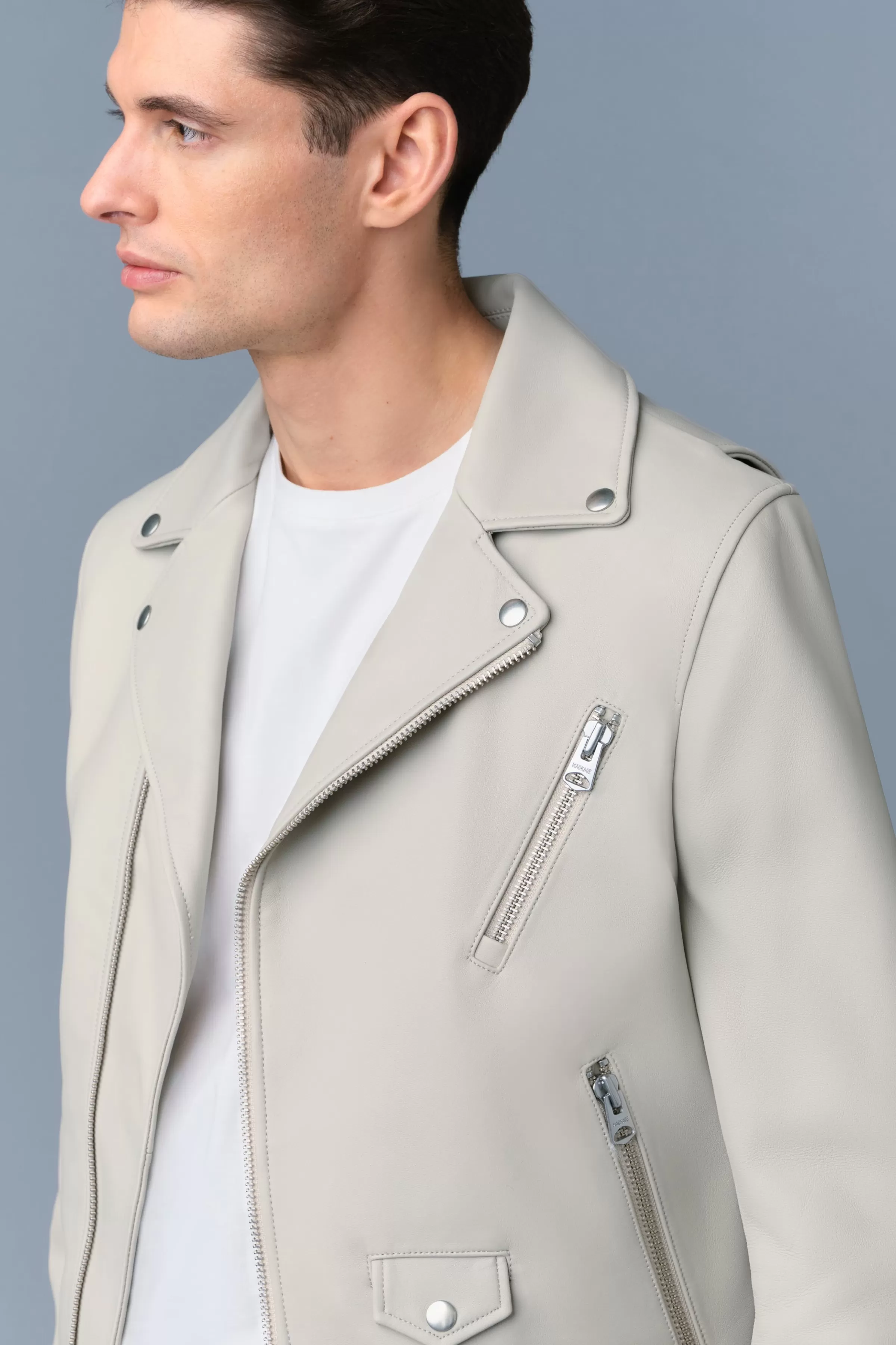 MAGNUS-CN is a classic biker for men crafted from supple lamb leather. Expertly tailored for a slim fit, it features a removable tonal hooded bib made from plush double face jersey. The asymmetrical closure, notch collar, and studded tabs bring signature detailing. Action back paneling adds to the comfortable feel. A modern and modular statement layer.